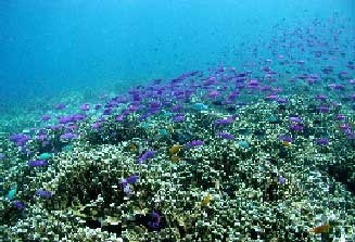 | 海の生物 | 1. クマノミはこのエリアでは7種(クマノミ、カクレ、セジロ、ハナビラ、ハマ、スパインチーク、トウアカ)見られる。 2. ペスカドールのパープルビューティの群れは大変美しい。 3. アポ島のクマノミ城。 |