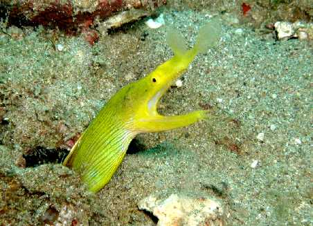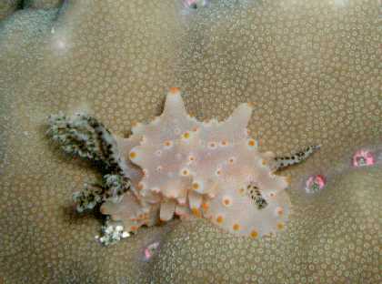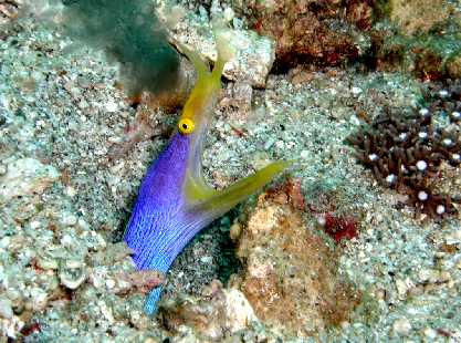サンゴはハードよりソフトが多い。大物は期待できないがマクロ系の生物はじっくり探せばかなりいろいろ見えると思う。 デジカメも透明度の悪く、暗い海の為、ワイド写真は無理な為にウミウシ・ハナジャコ・ハナヒゲウツボなどの生物を中心に撮った。 |