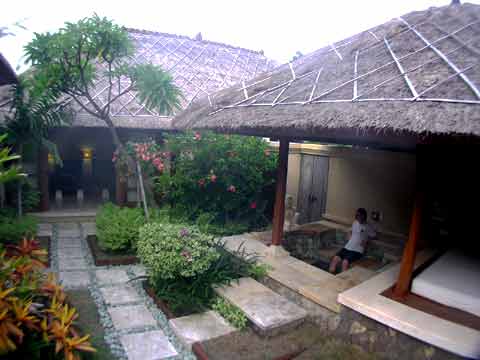 今回利用した“BALI MIMPI RESORT, MENJANGAN”にはプライベートの天然温泉の露天風呂付きの部屋があった。今回のパッケージでは一般の部屋だったので旅行代理店からアップグレードしようとしたら一人一泊あたり8000円X2名と言うことで一旦はあきらめたが、現地で直接交渉したら100US$(一泊・ROOM)になったのですぐに変更した。一人5000円強で高いような気はしたが、24時間流しっぱなしも可能な温泉だけでなく、門構え付きのこの部屋は全てにおいてグレードが高く、納得できる値段だった。お勧め。 |