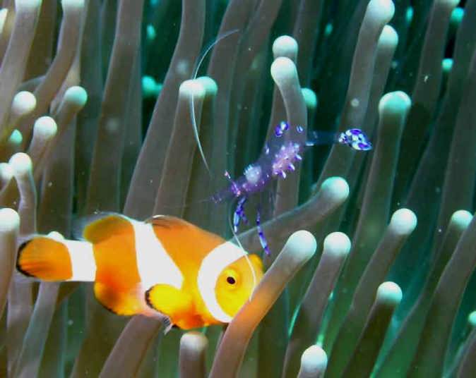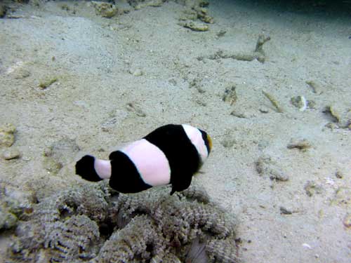 大物はだめだったが、ピグミー・シーホースや真ん中の白い部分が横縞で普通と違うトウアカクマノミ、カクレエビ等のマクロ系はいろいろ見ることが出来た。 |