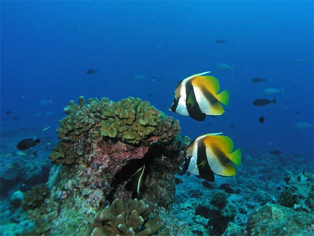 | 海況 | 西風のシーズン、しかも8月に入って荒れた天気が多いと聞いていた為、運の悪いPOYONさんfamilyとしては外洋は諦めムードで出掛けた。 快晴とはいかなかったが、風の弱い日もあり外洋のブルーコーナー方面もいっぱい潜れた。 |