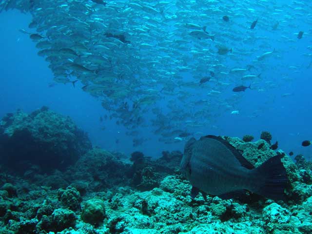 | DIVING | 正月休みのパラオは乾季にもかかわらず雨で寒かったが、今回、またしても4日間のダイビングの2日が雨で寒い思いをした。今年の乾季(?)はどうもおかしい。世界のあちこちの異常気象がここでも現れているようだ。 風は乾季の風(北、北東)で西側の外洋へ出るのには問題はなかった。 |