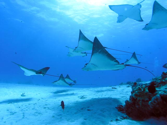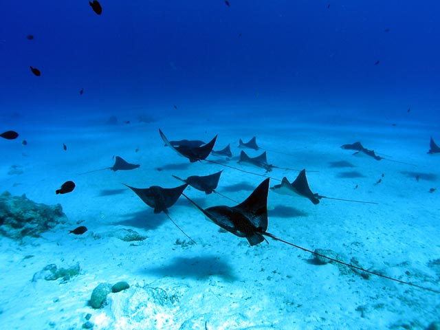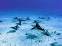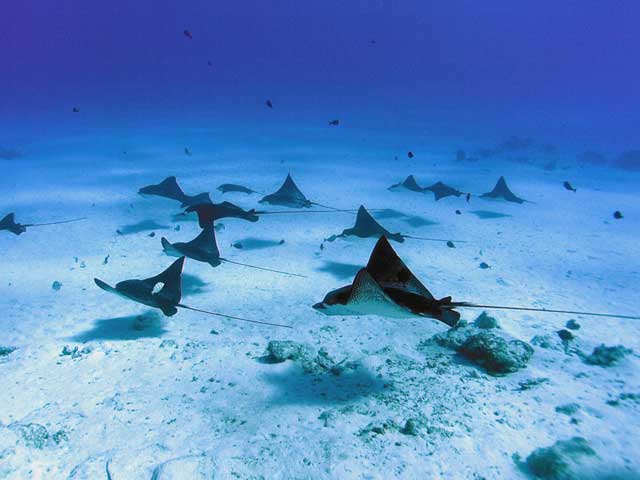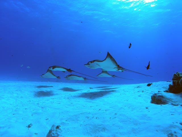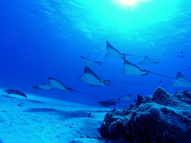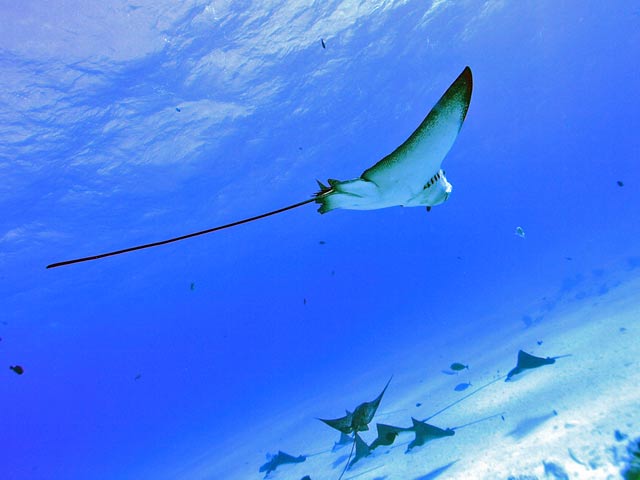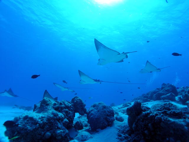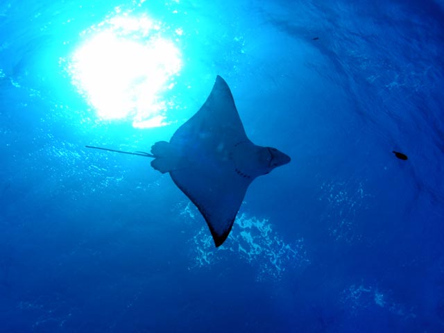 | DIVING | この日のエイポイントでのマダラトビエイは15〜20枚位いた。砂の巻上げもなく、透明度が30m位あり楽しめた。去年は全く不振だったのだが今年は多いときは60枚出ているそうだ。 |