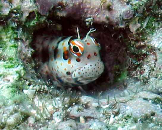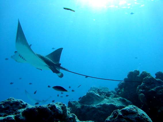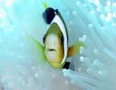 | DIVING | 日目は、アジ玉がいたという「パイプ」へ行ってみたが残念ながらいなかった。 2日目の「イーグルレイシティ」では、朝一番乗りだったので、30匹ぐらいが近くを泳いでくれた。水面から上へジャンプをするものや近くをゆっくり通り過ぎるものがいた。目は奥まっていて大きな丸い目だった。「とうだい」で白いイソギンチャクにクマノミがいるのを見た。一匹は尾が黄色だった。あんまり撮していたらイソギンチャクへ戻らず遠出をするようになってしまった。 |