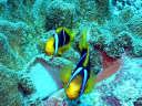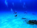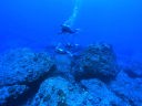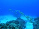 | DIVING | 日本に接近中の台風13号、14号の影響のウネリがまだ残っていた。 そのため西側の通常ポイントを避けて普段はなかなか行けない東側まで行く事が出来てラッキーだった。 東側ではFORBIDDEN Is.(禁断の島)とナフタンの東側を潜った。どちらも透明度は50m位はあり気持ち良いダイビングだった。ナフタンの東側は東側らしく巨大な石がゴロゴロしている殺風景なポイント、禁断の島ではドロップオフでギンガメアジ、ナポレオンも見られ、棚の上ではサンゴに付いたチョウチョウウオ、ハギ、ベラなどが見所。 |